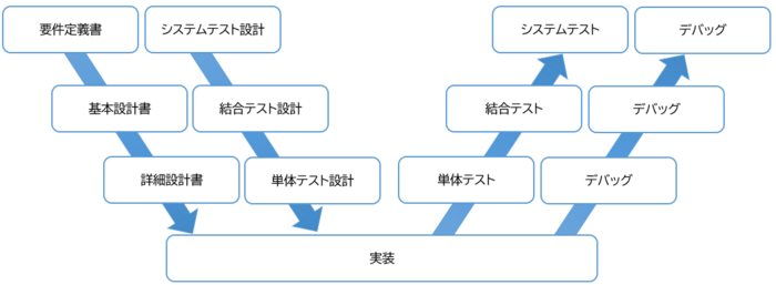 V字モデルでは、上流工程で「設計」を行い、テスト工程で「テスト設計・実行」を行います。