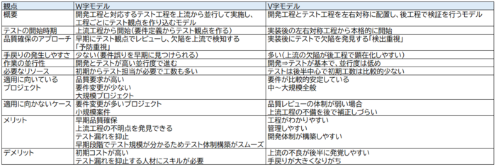 W字モデルとV字モデルの比較表