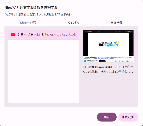 上記コードの修正により[call]ボタンを押下時に以下のような画面が現れ、 選択した画面を送信するストリームとして指定できるようになります。
