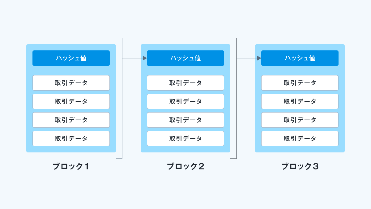 取引記録(データ)を「ブロック」という単位でまとめ、そのブロック同士をハッシュ値で鎖のようにつなぎ、ネットワーク全体で共有する分散台帳技術