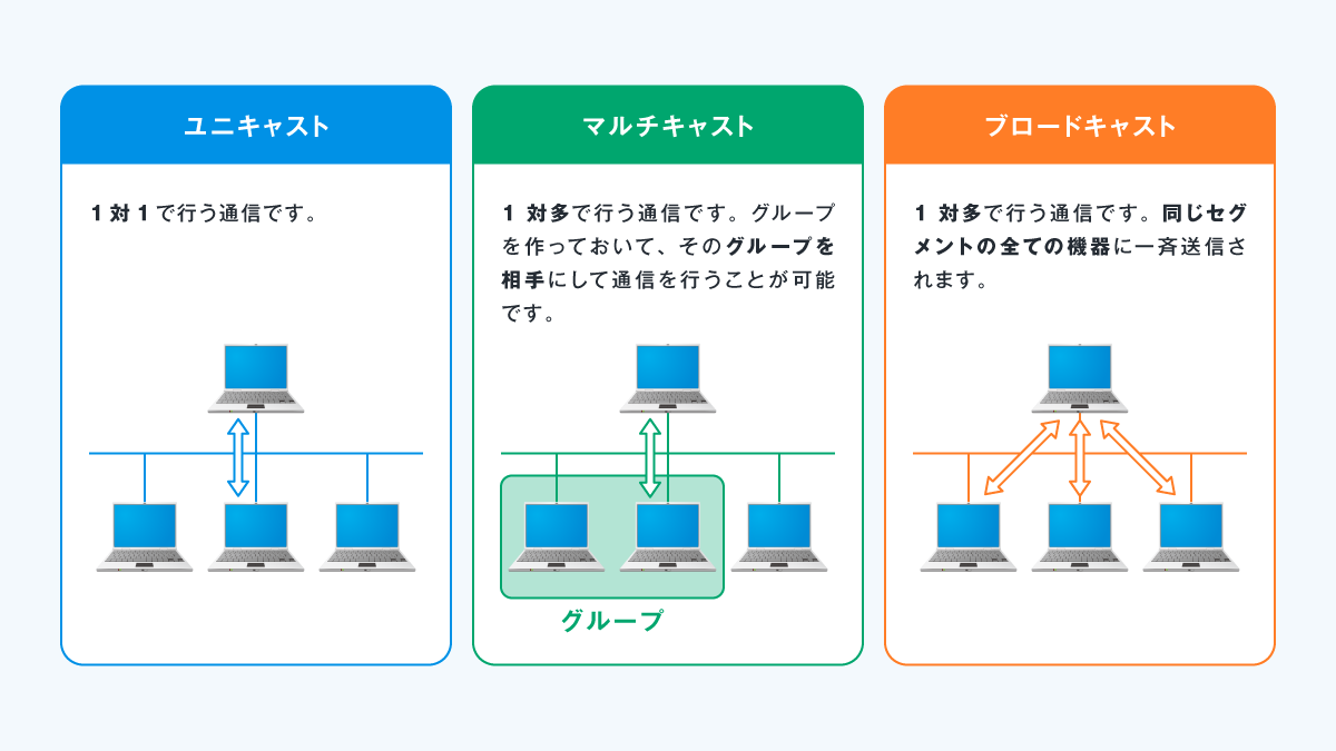 コンピューターが行う通信は、大きく下の図に示した3種類に分けることができます。