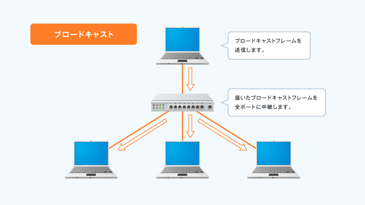したがって、レイヤ2スイッチはブロードキャストフレームを受信すると、すべてのLANポートに対してそのフレームを中継します。