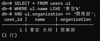 users テーブルを用いて、開発部以外の'青空'から始まる名前のユーザーを検索するクエリを作成しました。