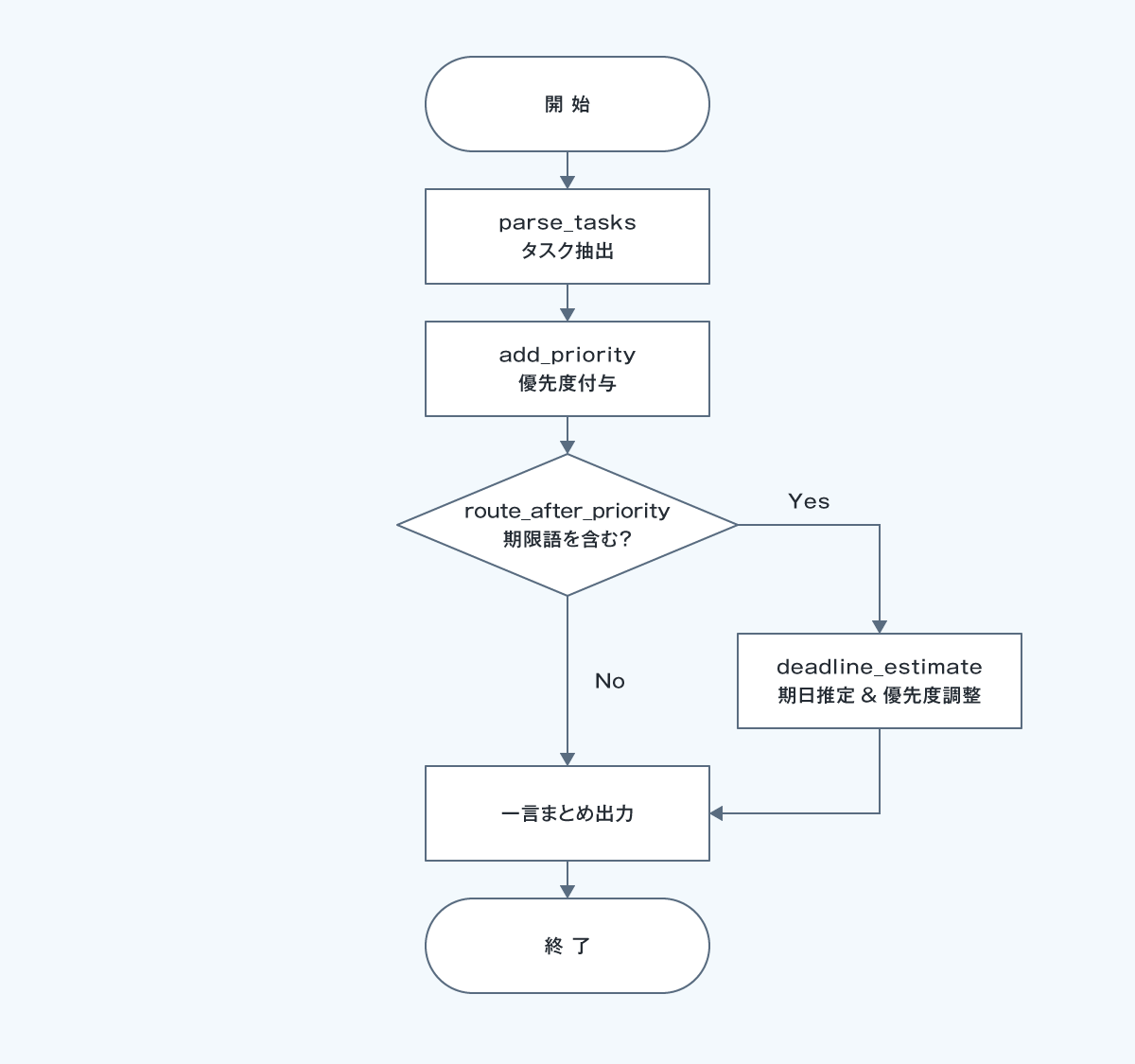 - route_after_priority : 期限語の有無で、次のノードを分岐する (条件付きエッジのルーター)